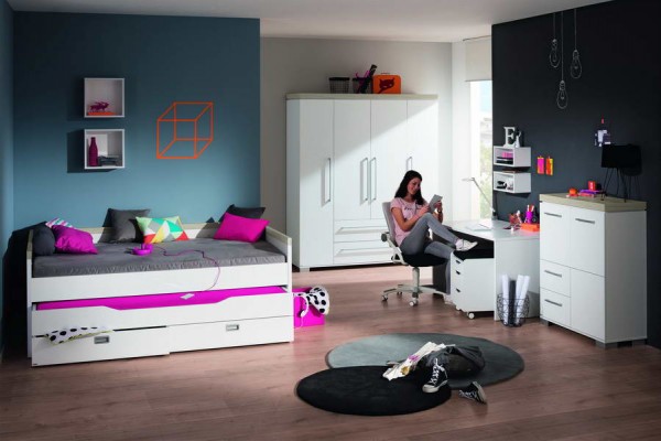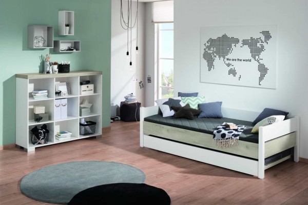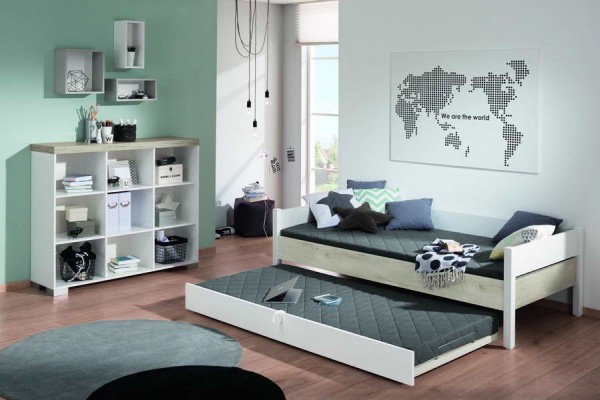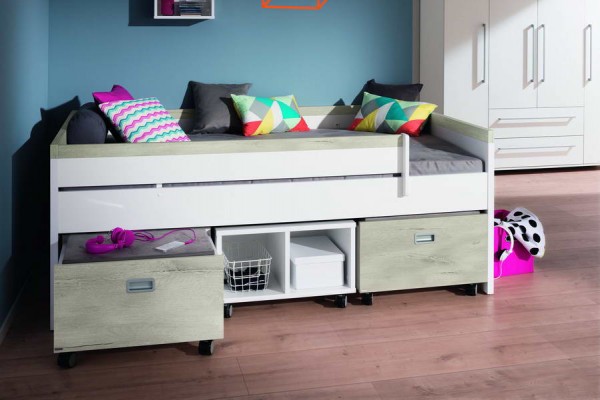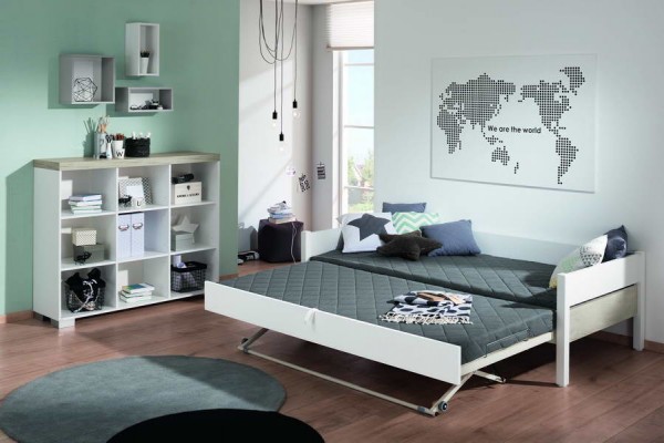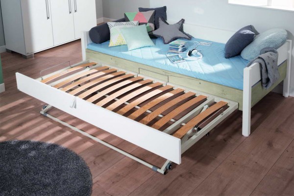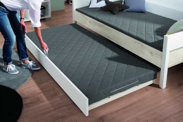 Завдяки частині, що висувається, ліжко з розміру 90х200см перетворюється на велике двоспальне ліжко розміром 200х198х50см, що напевно сподобається дитині - підлітку. Висувну частину ліжка з Німеччини можна замінити зручним висувним ящиком для білизни або двома закритими ящиками на роликах або відкритими стелажами для взуття та інших речей.