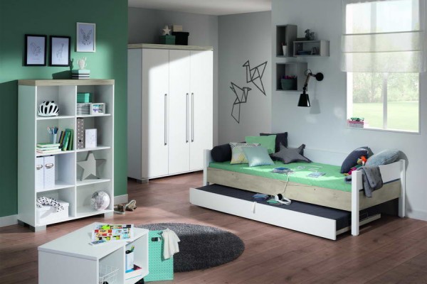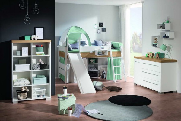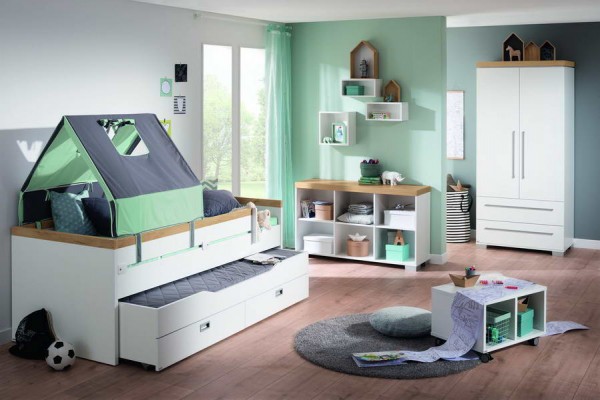 З чого починається дитяча? Звичайно, з ліжка, і тут у Вас вибір у комбінації кольорів: білий + дуб Небраска (натуральний дерев'яний відтінок та структура дерева) або білий + дуб Наутик (світло-сірий відтінок та структура дерева). Тим більше, якщо у Вас вже є в кімнаті біла шафа або стелаж, ліжко в комбінації білий+дуб зробить необхідний акцент і додасть сучасний природний штрих до вашої дитячої кімнати. А зростаюча німецька парта в кольорі дуб Небраска або дуб Наутик точно буде неповторною, адже цей декор використовує тільки німецька компанія Paidi. Як і в інших серіях дитячих меблів з Німеччини, ліжка Кіра можуть бути різних висот: 60см, 120см, 160 см та 180см. Звичайно, якщо дозволяє простір, то ми рекомендуємо для ігрових і двоярусних ліжок похилих сходів (під кутом), тому що вони більш безпечні для лазіння дитини на другий ярус. Але якщо кімната невелика, то пряма (вертикальна) драбинка – правильне рішення. Робити у вашому ліжку гірку чи ні – це ваше рішення. Дитяча активність поліну як у дошкільному, і у шкільному віці. Низьке розсувне німецьке ліжко також часто використовується для економії простору, якщо у Вас дві дитини.
