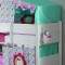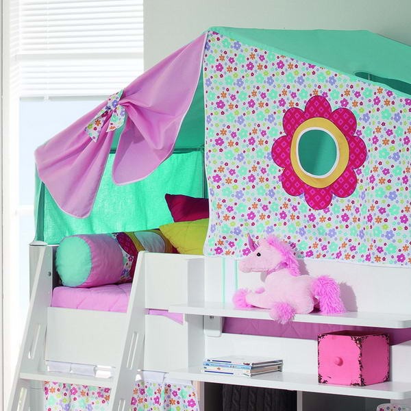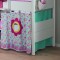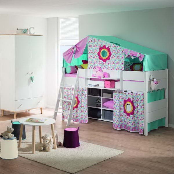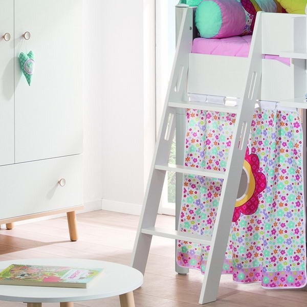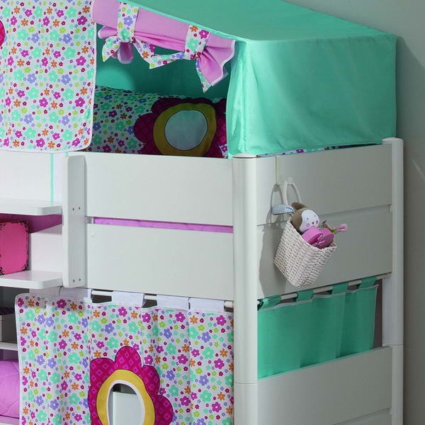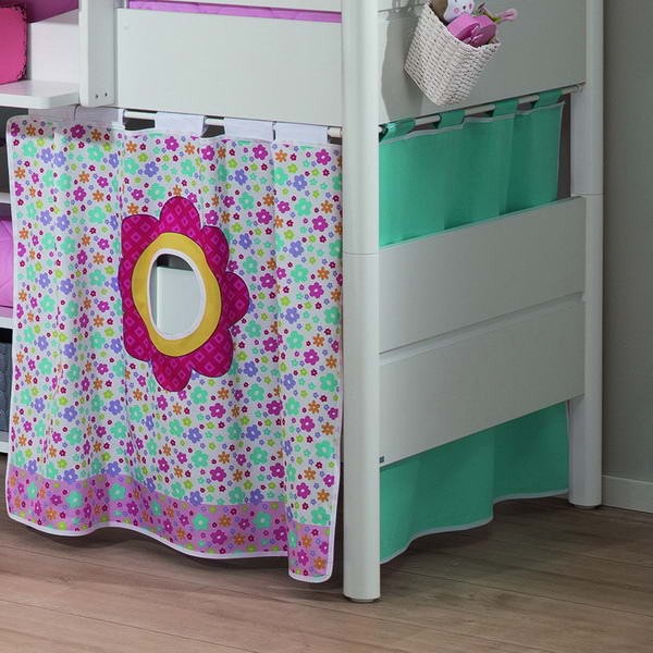 Ліжко укомплектоване похилою драбинкою, яка може бути встановлена за вашим бажанням ліворуч або праворуч. Декор Квіти виконаний з бавовни і включає: каркас і текстиль намету верхнього поверху, каркас для шторок і три шторки з круглими стилізованими віконцями першого поверху, два матраци зі знімними чохлами бірюзового кольору. Коли діти підростуть, можна розібрати ліжко на дві одномісні.