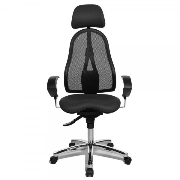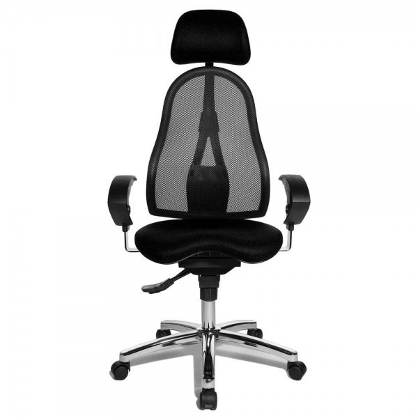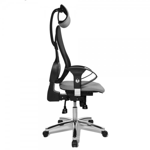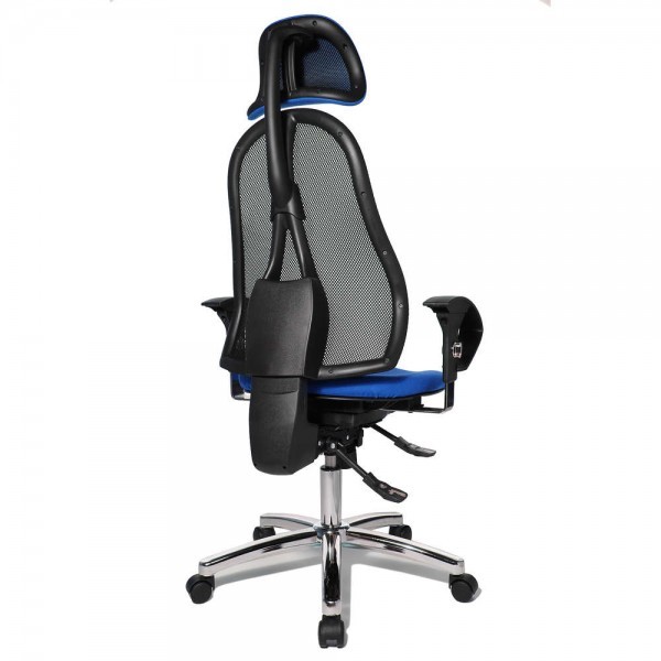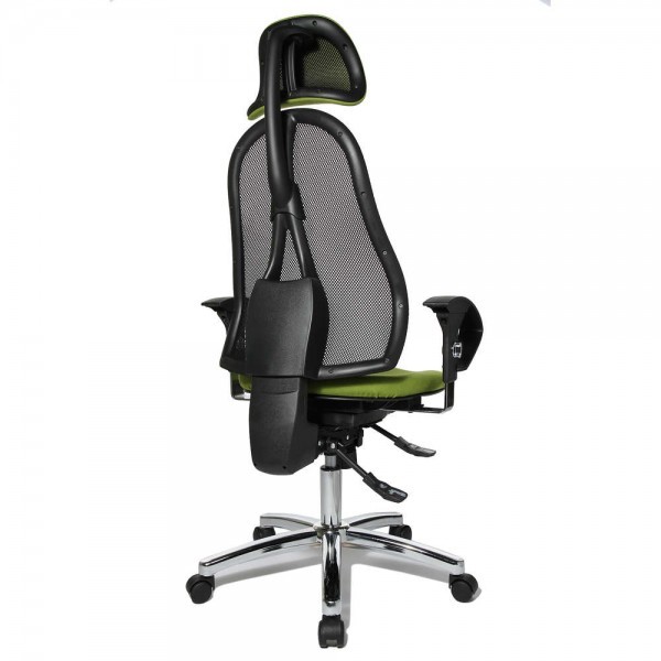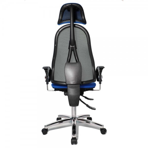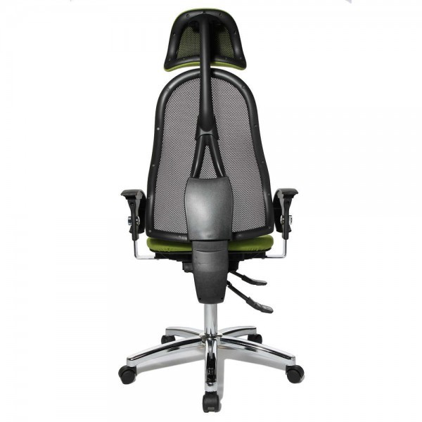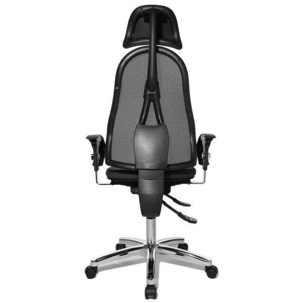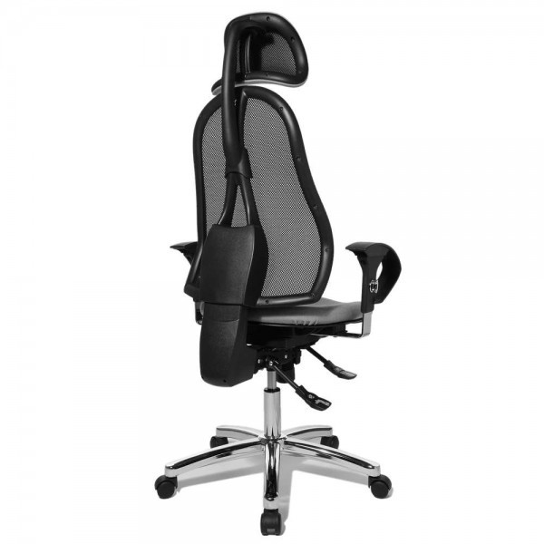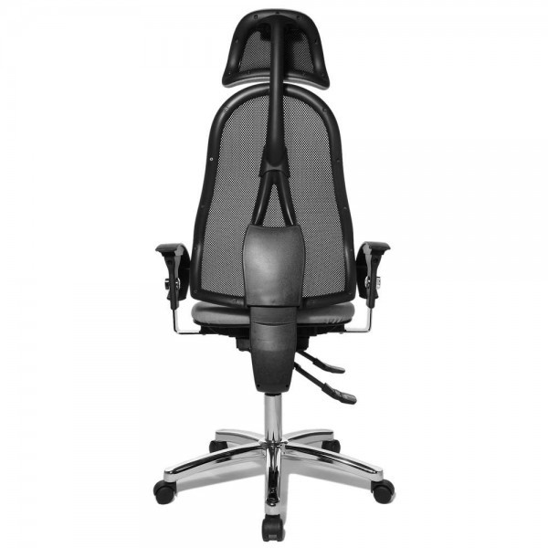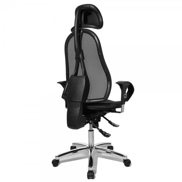 Спинка має ергономічну форму і виконана з "сітки, що дихає", плавно регулюється по висоті і куту нахилу. Завдяки вбудованій підтримці попереку, Ви зможете розслабити м'язи поперекового відділу хребта. А значить, спина менше втомлюватиметься під час використання крісла. В ергономічному німецькому офісному кріслі Sitness 45 використовується перманент-контакт з фіксацією спинки в будь-якому положенні, а також індивідуальне, що блокується в різних положеннях, регулювання жорсткості гойдання в залежності від ваги. Підлокітники з хромованою основою, що регулюються по висоті, поєднуються по дизайну з полірованою хрестовиною офісного ергономічного крісла.
