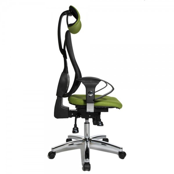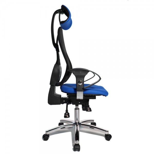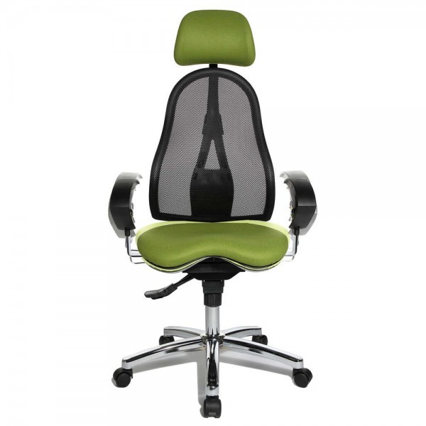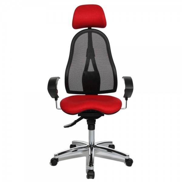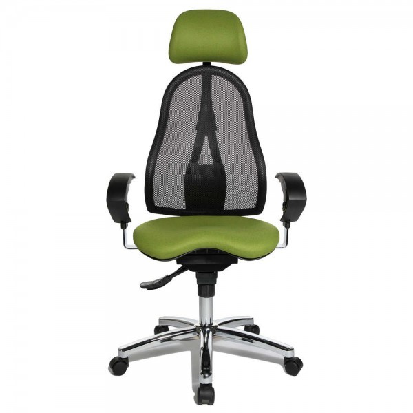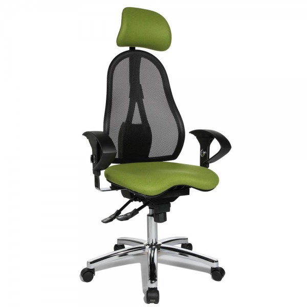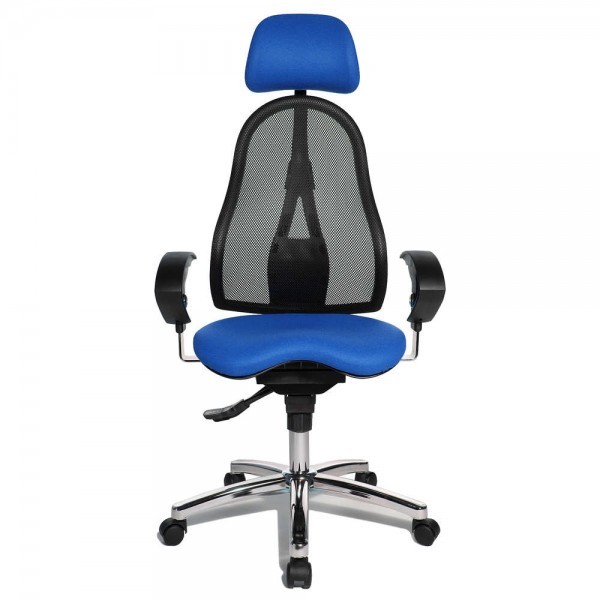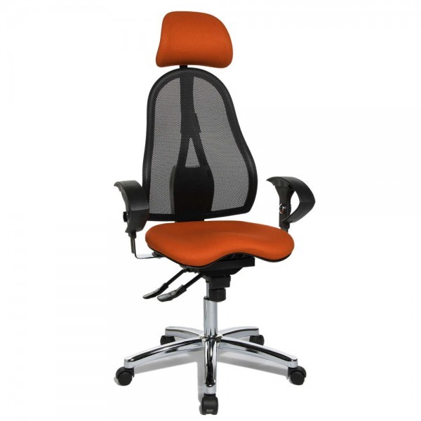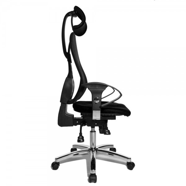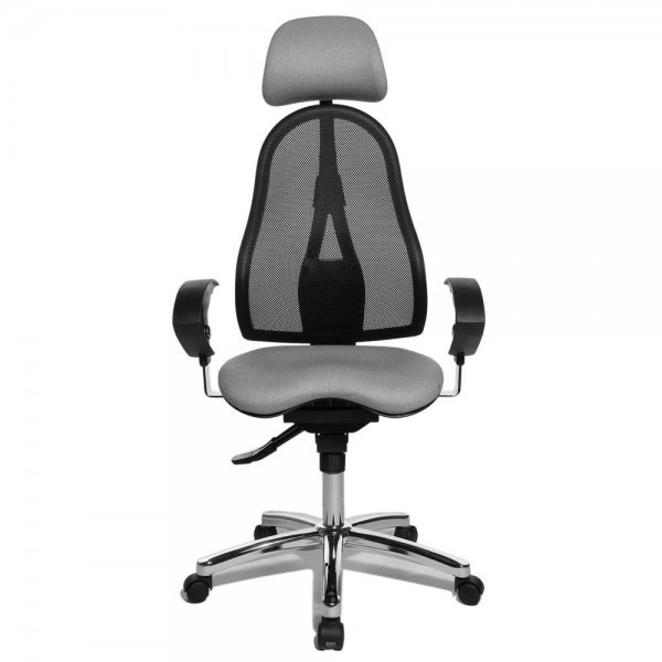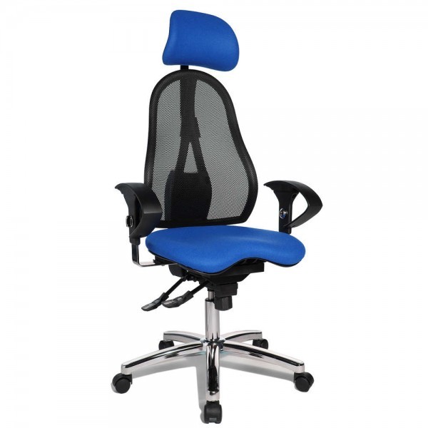 Спинка має ергономічну форму і виконана з "сітки, що дихає", плавно регулюється по висоті і куту нахилу. Завдяки вбудованій підтримці попереку, Ви зможете розслабити м'язи поперекового відділу хребта. А значить, спина менше втомлюватиметься під час використання крісла. В ергономічному німецькому офісному кріслі Sitness 45 використовується перманент-контакт з фіксацією спинки в будь-якому положенні, а також індивідуальне, що блокується в різних положеннях, регулювання жорсткості гойдання в залежності від ваги. Підлокітники з хромованою основою, що регулюються по висоті, поєднуються по дизайну з полірованою хрестовиною офісного ергономічного крісла.